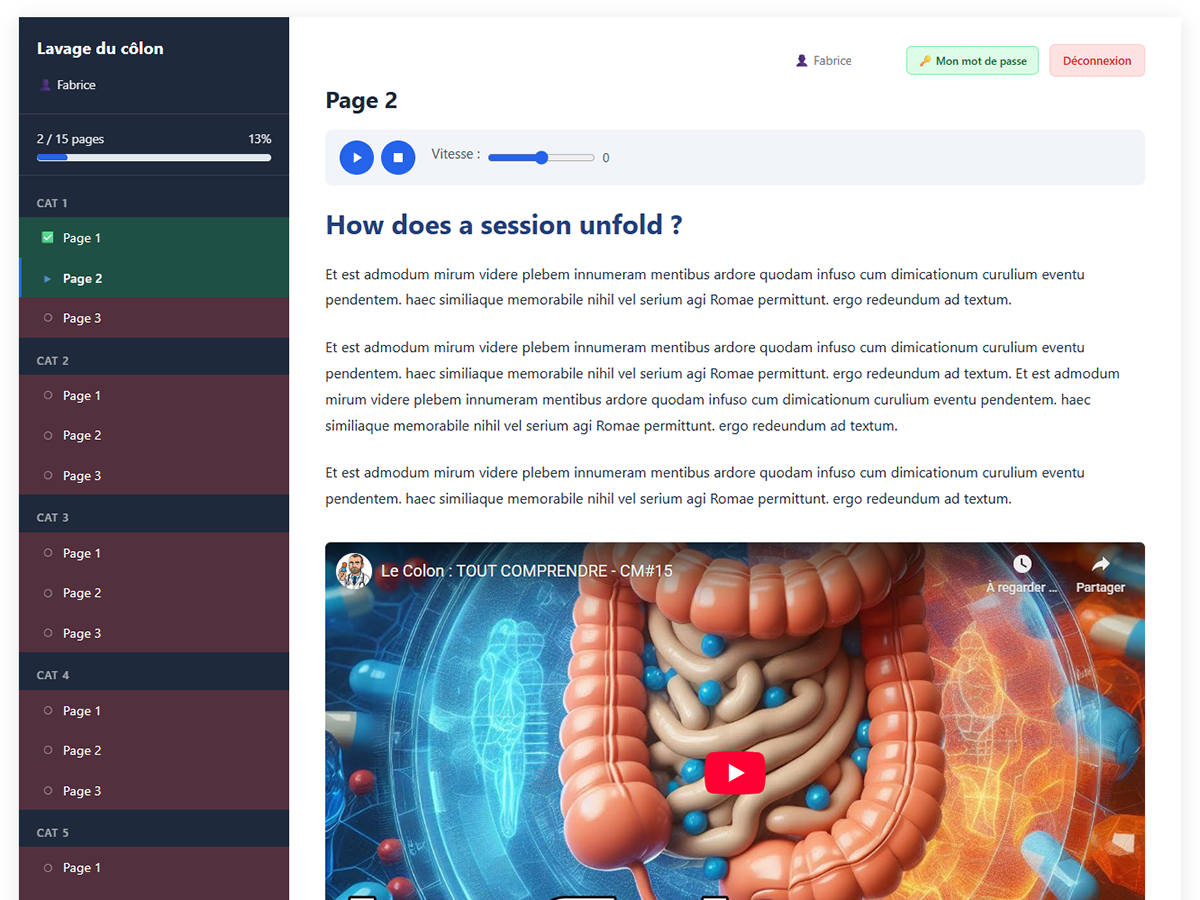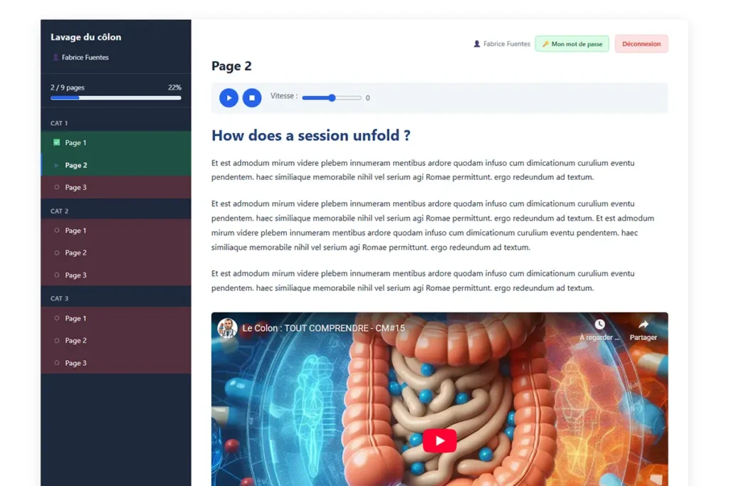 Formations illimitées, accès sécurisé par identifiants uniques, lecteur audio intégré, vidéos YouTube et Vimeo, statistiques de progression en temps réel, envoi automatique des accès par email, export CSV, interface traduite en 11 langues et design entièrement personnalisable. Tout ce dont vous avez besoin pour créer une expérience de formation professionnelle, sans aucune compétence technique.