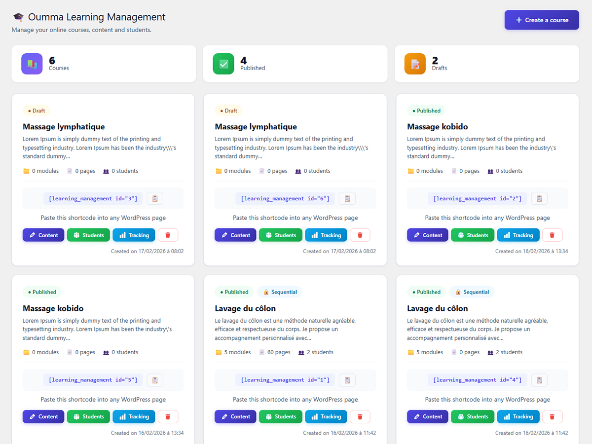 Le plugin de formation en ligne qui fait TOUT. Oumma Learning Management Pro transforme votre site WordPress en une véritable plateforme de formation professionnelle. En quelques clics, créez des formations structurées avec modules, pages et contenus enrichis, texte, images, vidéos YouTube et Vimeo, audio. Vos étudiants accèdent à leur espace avec des identifiants uniques, indépendants de WordPress, pour une sécurité totale.