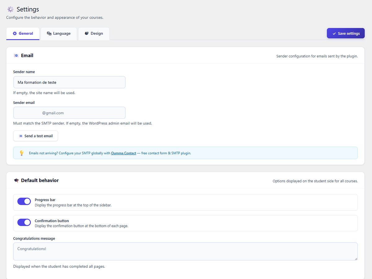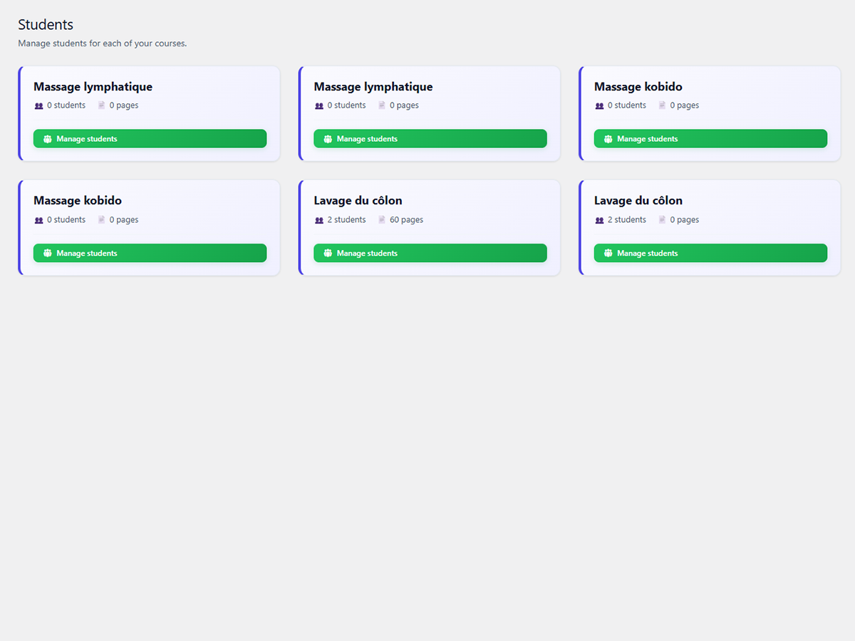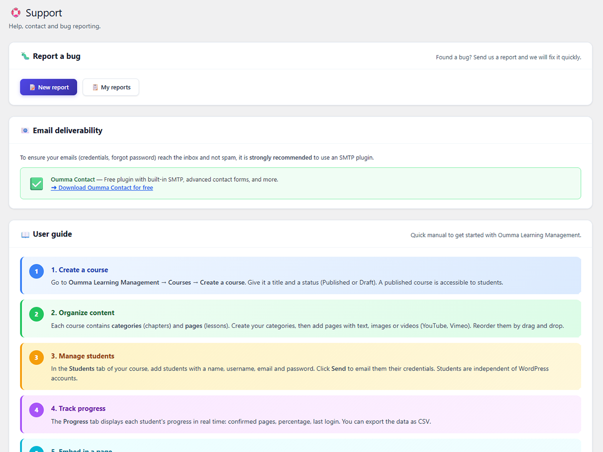 Là où les autres plugins vous noient dans la complexité, Oumma Learning Management Pro mise sur l’essentiel : une interface épurée côté admin, une expérience fluide côté étudiant. Suivi de progression en temps réel, lecteur audio intégré, envoi automatique des identifiants par email, import/export en un clic, design entièrement personnalisable, tout est pensé pour vous faire gagner du temps.