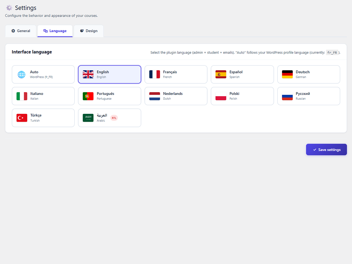 Vendez vos formations avec ou sans produit lié,  directement depuis votre site grâce à l’intégration WooCommerce : paiement, accès automatique et gestion des commandes, tout est connecté. 11 langues intégrées dont l’arabe avec support RTL. Formations illimitées. Étudiants illimités. Zéro restriction.